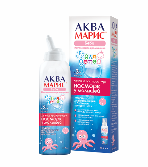 Изотоническая морская вода способствует поддержанию нормального физиологического состояния слизистой оболочки полости носа, способствует разжижению слизи и нормализации ее выработки в бокаловидных клетках слизистой оболочки носовой полости. После применения изделия АКВА МАРИС® БЕБИ повышается терапевтическая эффективность лекарственных средств, наносимых на слизистую оболочку носа, и сокращается продолжительность респираторных заболеваний. Изделие для промывания и орошения полости носа «АКВА МАРИС® БЕБИ» снижает риск распространения инфекции в пазухи носа и полость уха (гайморит, фронтит, отит). Снижает риск локальных осложнений и ускоряет процессы заживления после хирургических вмешательств (удаление аденоидов, полипов, септопластика и др.) на носовой полости. Снимает раздражение слизистой носа у лиц, слизистая оболочка верхних дыхательных путей которых постоянно подвергается вредным воздействиям (курильщики, водители автотранспорта, люди, живущие и работающие в помещениях с кондиционированным воздухом и/или центральным отоплением, работающие в горячих и запыленных цехах, а также находящиеся в регионах с суровыми климатическими условиями).