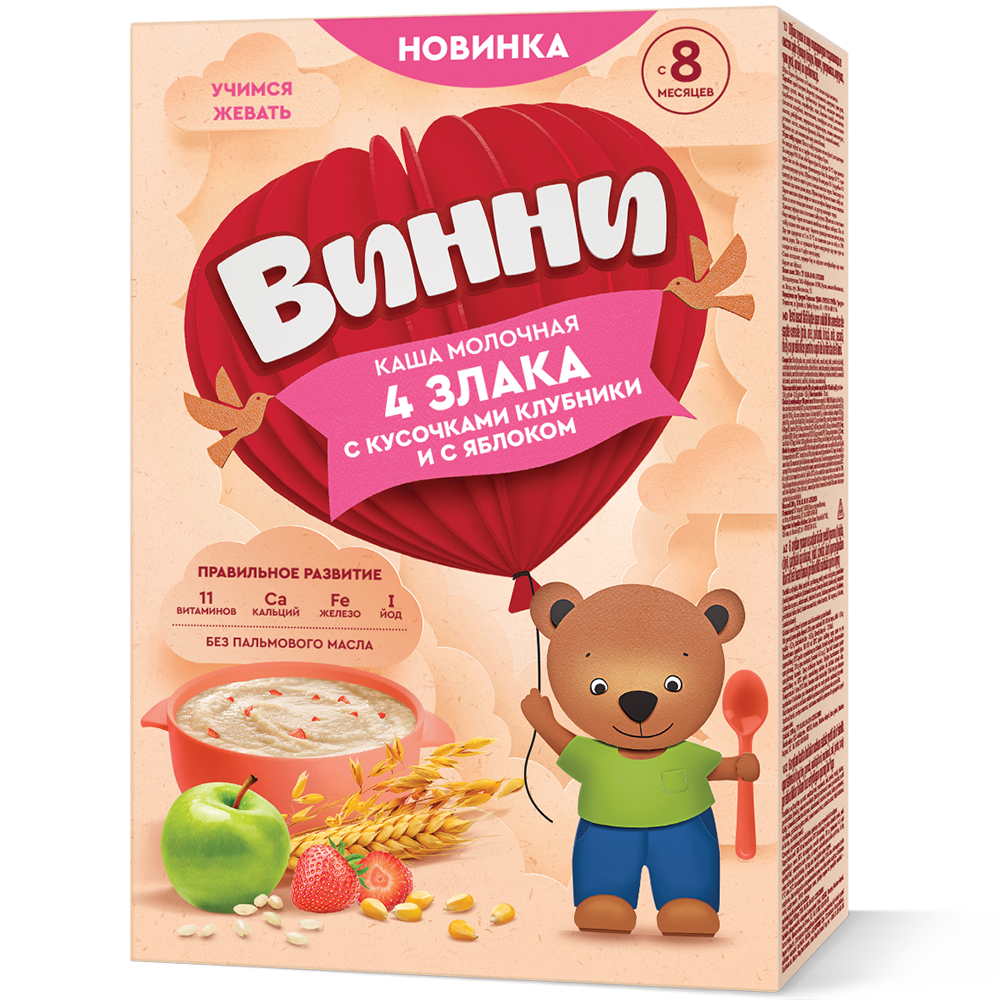 КАША МОЛОЧНАЯ ВИННИ 4 ЗЛАКА С КУСОЧ КЛУБНИКИ И ЯБЛОКИ 200ГР