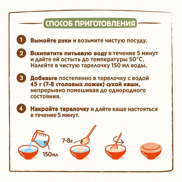 - Добавьте постепенно в тарелочку с водой 50 г (7–8 столовых ложек) сухой каши, непрерывно помешивая до однородного состояния. Накройте тарелочку и дайте каше настояться в течение 5 минут.