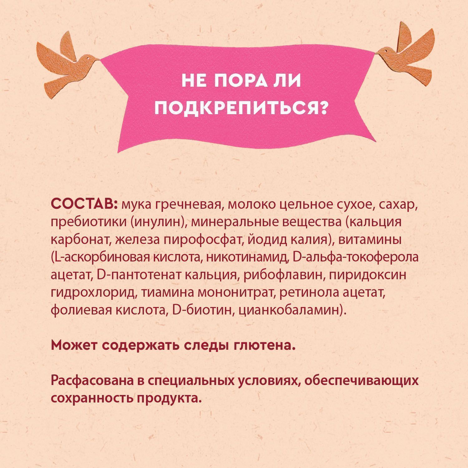 Мука гречневая, мальтодекстрин, пребиотики (инулин), минеральные вещества (кальция карбонат, железа пирофосфат, йодид калия), витамины (аскорбиновая кислота, никотинамид, D-альфа-токоферола ацетат, D- пантотенат кальция, рибофлавин, пиридоксин гидрохлорид, тиамина мононитрат, ретинола ацетат, фолиевая кислота, D-биотин, цианкобаламин). Может содержать следы глютена и молока.