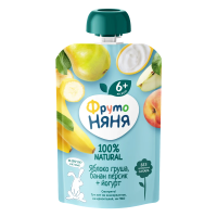 Фруктовое пюре «ФрутоНяня» из яблок, груш, бананов и персиков с йогуртом разработано специально для того, чтобы разнообразить рацион вашего малыша. В нём сочетаются вкус спелых фруктов и польза натурального йогурта, необходимого для гармоничного роста и развития малыша.