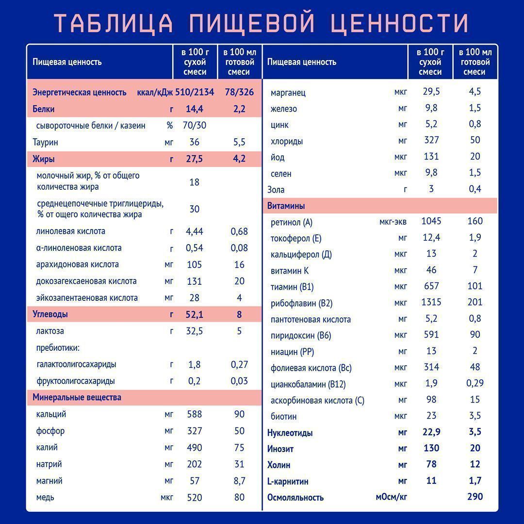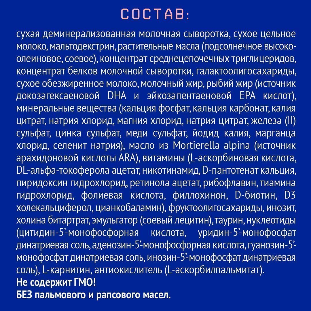 Сухая деминерализованная молочная сыворотка, сухое цельное молоко, мальтодекстрин, растительные масла (подсолнечное высокоолеиновое, соевое), концентрат среднецепочечных триглицеридов, концентрат сывороточных белков, галактоолигосахариды, сухое обезжиренное молоко, молочный жир, рыбный жир (источник докозагексаеновой DHA и эйкозапентаеновой EPA кислот), минеральные вещества (фосфат кальция, карбонат кальция, хлорид калия, цитрат калия, хлорид магния, сульфат железа, сульфат цинка, сульфат меди, йодид калия, хлорид марганца, селенит натрия), масло Mortierella Alpina (источник арахидоновой кислоты ARA), витамины (аскорбиновая кислота, токоферол ацетат, никотинамид, пантотеновая кислота, пиридоксин гидрохлорид, ретинол ацетат, рибофлавин, тиамин гидрохлорид, фолиевая кислота, филлохинон, d-биотин, холекальциферол, цианокобаламин), фруктоолигосахариды, инозитол, холин битартрат, эмульгатор (лецитин), таурин, нуклеотиды (цитидин 5’-монофосфорная кислота, уридин-5’- монофосфат динатриевая соль, аденозин -5’-монофосфорная кислота, гуанозин-5’-монофосфат динатриевая соль, инозин-5’-монофосфат динатриевая соль), L-карнитин, антиокислитель (аскорбилпальмитат).
