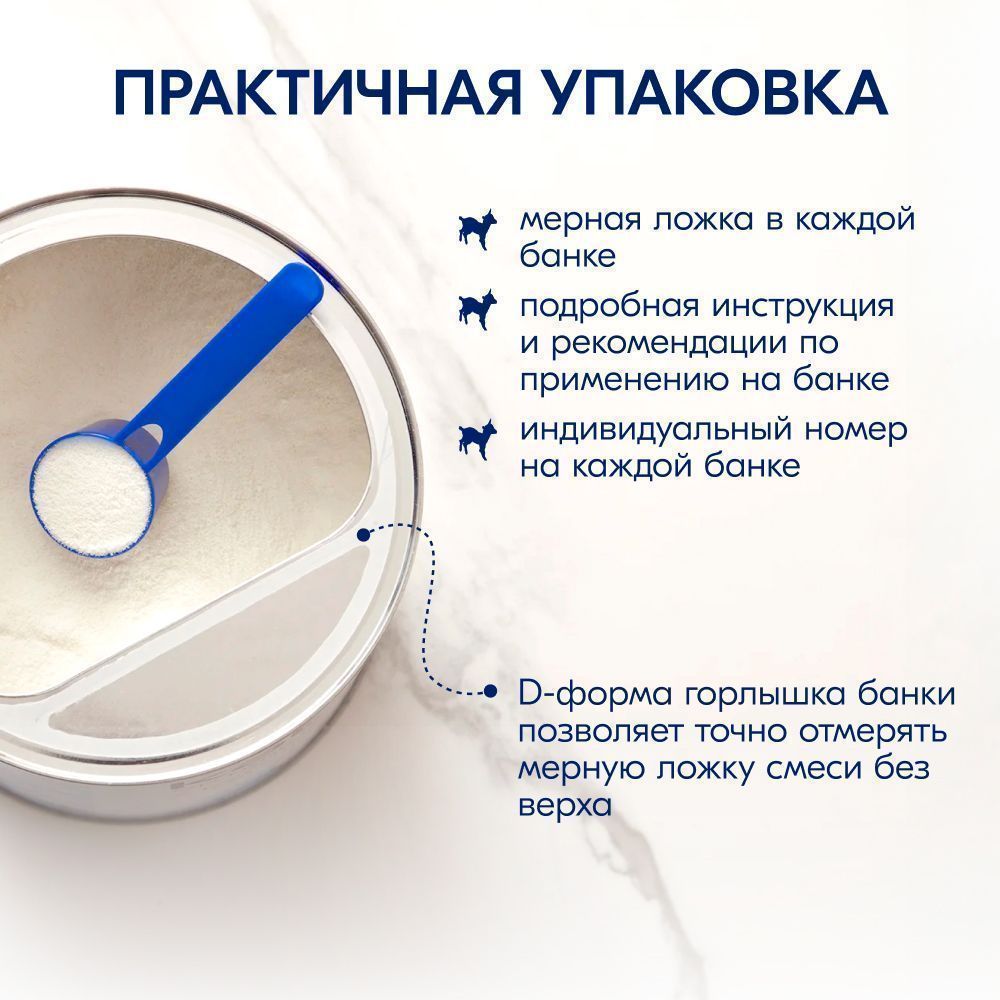 Лактоза, обезжиренное сухое козье молоко, цельное сухое козье молоко, растительные масла (кокосовое, низкоэруковое рапсовое, подсолнечное), комплекс жиров DigestX® (1,3-диолеол 2-пальмитоил триглицерид), галактоолигосахариды, минеральный премикс (кальция цитрат, кальциевая соль ортофосфорной кислоты, карбонат кальция, карбонат магния, железа сульфат, натрия цитрат, калия гидроксид, цинка сульфат, кальция фосфат, кальция хлорид, магния хлорид, магния сульфат, меди сульфат, йодид калия, селенат натрия), фруктоолигосахариды, рыбий жир (источник DHA), арахидоновая кислота, холина битартрат, витаминный премикс (L-аскорбат натрия, L-аскорбиновая кислота, DL-альфа-токоферола ацетат, ниацинамид (синоним – никотинамид), тиамина гидрохлорид, рибофлавин, пиридоксина гидрохлорид, ретинол ацетат, фолиевая кислота, D-пантотенат кальция, фитоменадион, холекальциферол, D-биотин, циаонокобаламин), инозитол, бифидобактерии (Bifidobacterium Animalis). Не содержит кристаллический сахар.