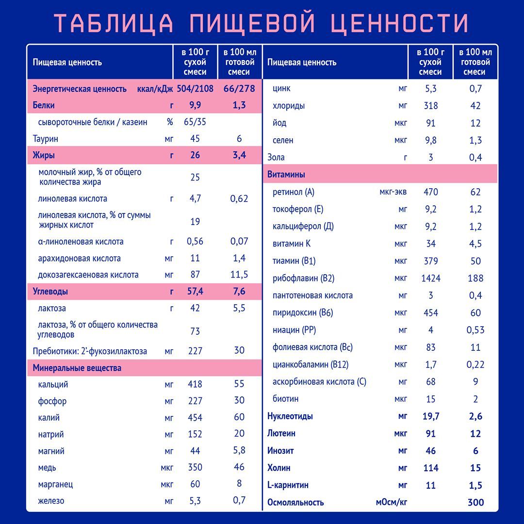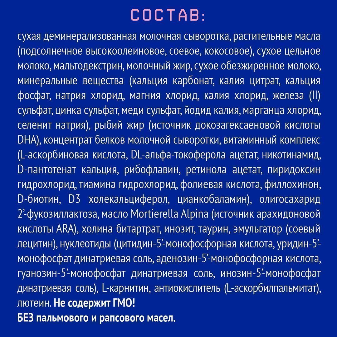 Сухая деминерализованная молочная сыворотка, растительные масла (подсолнечное высокоолеиновое, соевое, кокосовое), сухое цельное молоко, мальтодекстрин, молочный жир, сухое обезжиренное молоко, минеральные вещества (кальция карбонат, калия цитрат, кальция фосфат, натрия хлорид, магния хлорид, калия хлорид, железа (II) сульфат, цинка сульфат, меди сульфат, йодид калия, марганца хлорид, селенит натрия), рыбий жир (источник докозагексаеновой кислоты DHA), концентрат белков молочной сыворотки, витаминный комплекс (L-аскорбиновая кислота, DL-альфа-токоферола ацетат, никотинамид, D-пантотенат кальция, рибофлавин, ретинола ацетат, пиридоксин гидрохлорид, тиамина гидрохлорид, фолиевая кислота, филлохинон, D-биотин, D3 холекальциферол, цианкобаламин), олигосахарид 2’-фукозиллактоза, масло Mortierella Alpina (источник арахидоновой кислоты ARA), холина битартрат, инозит, таурин, эмульгатор (соевый лецитин), нуклеотиды (цитидин-5’-монофосфорная кислота, уридин-5’- монофосфат динатриевая соль, аденозин-5’-монофосфорная кислота, гуанозин-5’-монофосфат динатриевая соль, инозин-5’-монофосфат динатриевая соль), L-карнитин, антиокислитель (аскорбилпальмитат), лютеин.