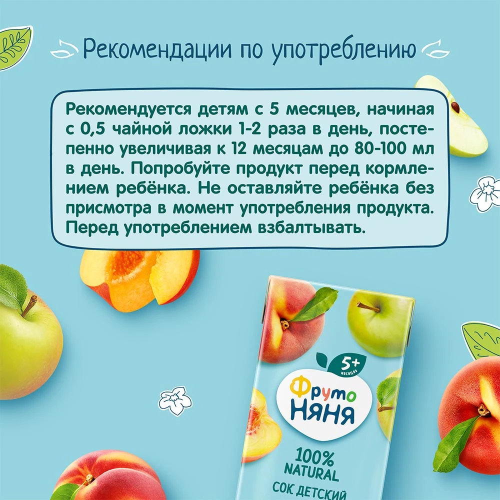 Сок из яблок и персиков «ФрутоНяня» подарит малышу солнечное настроение. Ведь это яркое сочетание на 100% натурального сока спелых яблок и пюре из персиков. «ФрутоНяня» сок из яблок и персиков поможет со вкусом и пользой разнообразить рацион ребенка старше 5 месяцев, чтобы он получал только натуральное для гармоничного роста и развития. Возьмите с собой в дорогу или на прогулку упаковку сока 200 мл, чтобы малыш мог насладиться ярким вкусом в любое время.