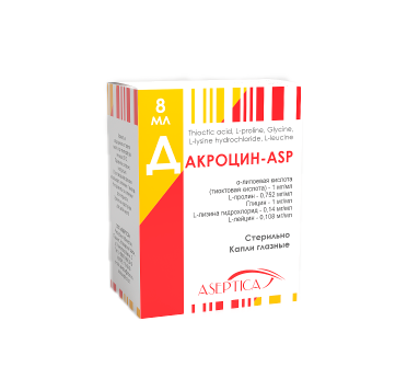 Дакроцин-ASP - антиоксидант, регулятор метаболических процессов в офтальмологии. Механизм действия. Липоевая кислота играет основную роль в качестве антиоксиданта и хелатообразователя. Непосредственно инактивирует свободные радикалы. Уменьшает окисление липидов клеточных мембран, особенно в нервных клетках роговицы, позволяет сохранить чувствительность роговицы. Повышает эндогенный антиоксидантный потенциал. Улучшает эндотелиальную функцию. Аминокислоты в составе глазных капель способствуют сохранению метаболической активности тканей глаза, которая обычно нарушается у пациентов с сахарным диабетом. Нормализуют функцию клеточных мембран и активизируют энергетические и обменные процессы. L-пролин является одним из важнейших компонентов коллагенового белка - основы всех тканей в организме человека. Поддерживает в нормальном состоянии соединительные ткани (склеру глаза, сосуды). Глицин - центральный нейромедиатор тормозного типа действия, улучшает метаболические процессы. Оказывает положительное влияние при мышечной дистрофии. L-лизина гидрохлорид оказывает противовоспалительное, противоотечное, обезболивающее действие. Повышает тонус сосудов, проявляет умеренный иммунокорригирующий и гипогликемический эффекты. L-лейцин участвует в синтезе белка, активизирует клеточный и гуморальный иммунитет, повышает функцию фагоцитов, активирует процессы биосинтеза аминокислот, их предшественников и метаболитов, предотвращает нарушения обмена веществ, возникающие при стрессе. Гидроксипропилметилцеллюлоза - полимер высокой вязкости, способствует восстановлению и стабилизации оптических характеристик слезной пленки. Протектор эпителия роговицы. Оказывает защитное действие относительно роговицы при сниженной секреции слезной жидкости. Кислота борная обеспечивает антисептический эффект, обладает буферными свойствами и используется как регулятор рН в составе глазных капель.