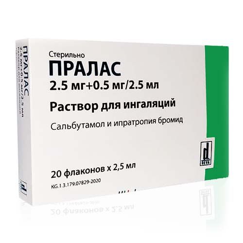 Пралас оказывает одновременную доставку ипратропия бромида и сульфата сальбутамола, что позволяет воздействовать на мускариновые и β2-адренергические рецепторы в легких, приводя к повышению бронходилатации по сравнению с эффектом достигаемым каждым препаратом отдельно.