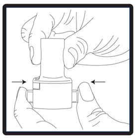 5. Для высвобождения порошка из капсулы: · Держите устройство в вертикальном положении мундштуком вверх. · Проткните капсулу одновременно крепко нажав на две кнопки по краям. Сделайте это только один раз. Внимание: на этом этапе капсула может разделится и маленькие фрагмента желатина могут попасть к вам в рот или горло. Тем не менее, желатин съедобен и поэтому не опасен. Для уменьшения риска разделения желатиновой капсулы вынимайте капсулу из блистера непосредственно перед использованием и нажимайте на боковые кнопки только один раз. (смотрите 3). |