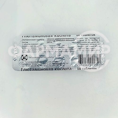 активное вещество – глутаминовая кислота (L-глютаминовая кислота) 250.0 мг,