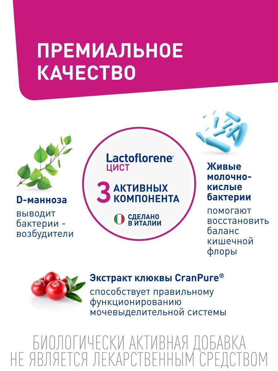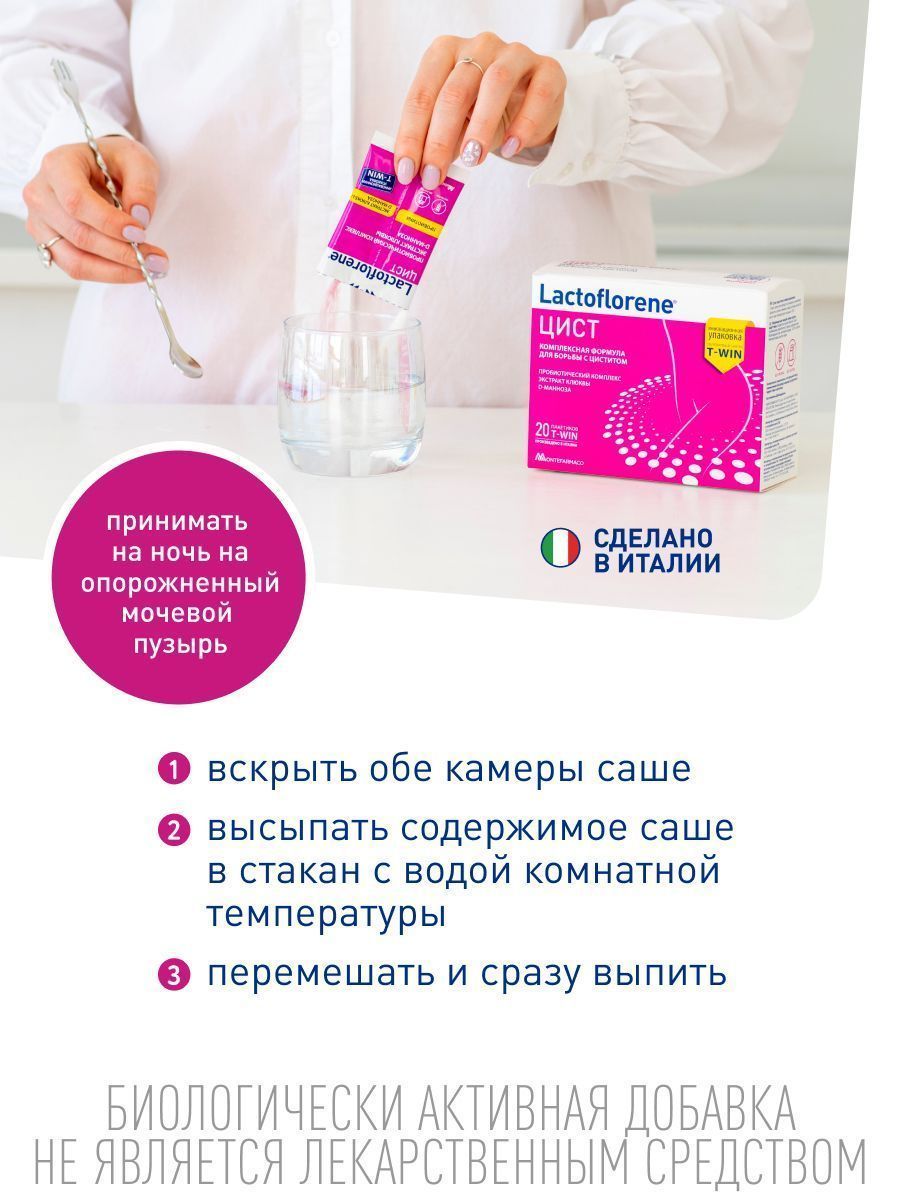 Lactoflorene® ЦИСТ – комплексная формула для борьбы с циститом. В состав входят пробиотики, растительные экстракты и D-манноза, которые способствуют уменьшению болей и резей при мочеиспускании, снижению риска появления инфекций мочевыводящих путей и дискомфорта от их проявлений. Lactoflorene® ЦИСТ представлен упаковкой T-WIN гарантирующей оптимальное сохранение свойств продукта: компоненты не взаимодействуют друг с другом внутри до использования. Lactoflorene® ЦИСТ – КОМПЛЕКСНАЯ ФОРМУЛА ДЛЯ БОРЬБЫ С ИНФЕКЦИЯМИ МОЧЕВЫВОДЯЩИХ ПУТЕЙ. БАД. НЕ ЯВЛЯЕТСЯ ЛЕКАРСТВЕННЫМ СРЕДСТВОМ.