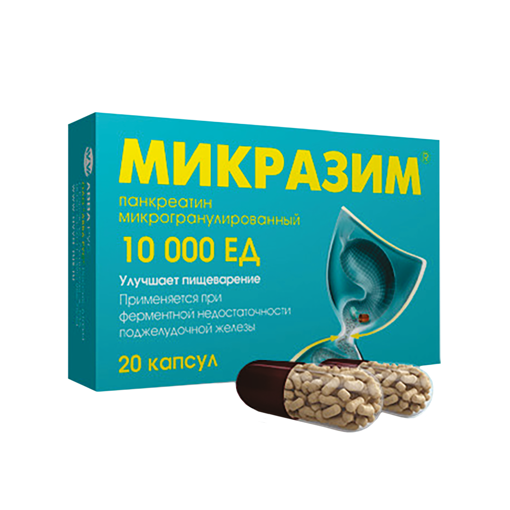 Микразим AVVA - пеллеты панкреатина в капсулах. В состав препарата входят натуральные ферменты из поджелудочной железы животных - протеаза, липаза и амилаза, обеспечивающие переваривание белков, жиров и углеводов пищи.
