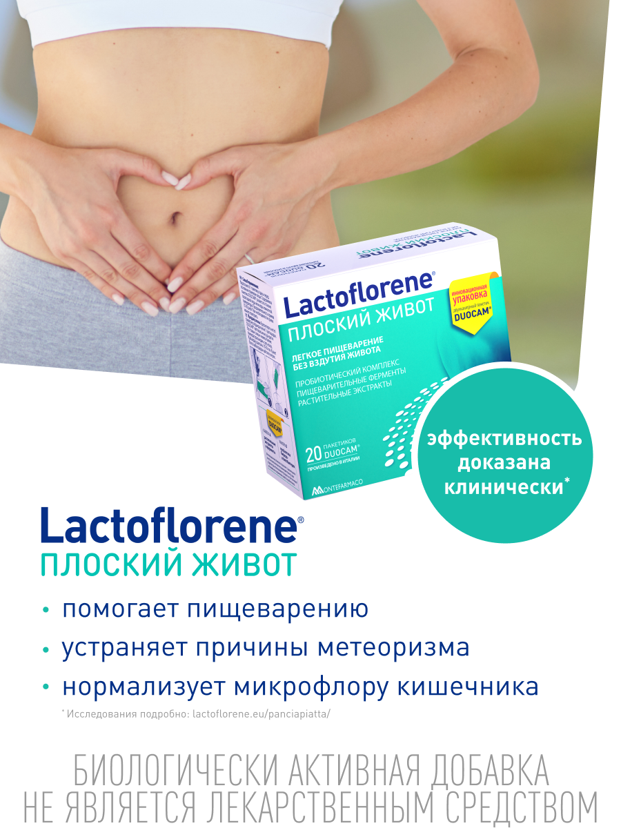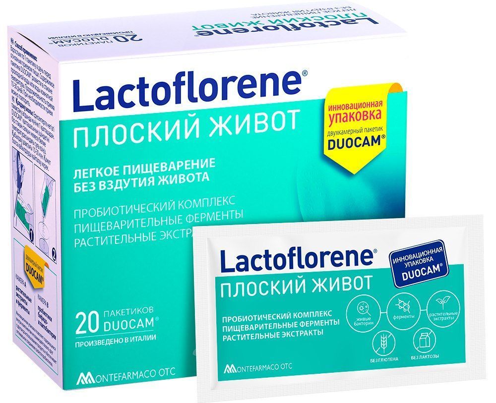Lactoflorene® ПЛОСКИЙ ЖИВОТ – ЛЕГКОЕ ПИЩЕВАРЕНИЕ БЕЗ ВЗДУТИЯ ЖИВОТА. Итальянский пробиотический комплекс для борьбы с метеоризмом. Lactoflorene® ПЛОСКИЙ ЖИВОТ устраняет причины возникновения метеоризма и обеспечивает комфортное пищеварение. В состав входят пробиотики, ферменты пищеварения и растительные экстракты, которые помогают бороться с разными причинами возникновения метеоризма. Живые бифидо и лактобактерии способствуют восстановлению баланса микрофлоры кишечника, подавляют активность газообразующих и гнилостных бактерий. Ферменты пищеварения в составе Lactoflorene® ПЛОСКИЙ ЖИВОТ это: альфа-галактозидаза - помогает переваривать сложные углеводы с высоким газообразующим потенциалом (бобовые, зерновые, масличные, корнеплоды), и бета-галактозидаза (лактаза) - способствует лучшему усваиванию молока или молочных продуктов. Растительные экстракты в составе Lactoflorene® ПЛОСКИЙ ЖИВОТ оказывают ветрогонный эффект, помогают уменьшить газообразование в ЖКТ и способствуют выведению уже скопившихся газов, а также оказывают антистрессовый эффект и способствуют расслаблению. Lactoflorene® ПЛОСКИЙ ЖИВОТ: ЕШЬ, ПЕЙ, ЖИВИ! БАД. НЕ ЯВЛЯЕТСЯ ЛЕКАРСТВЕННЫМ СРЕДСТВОМ.