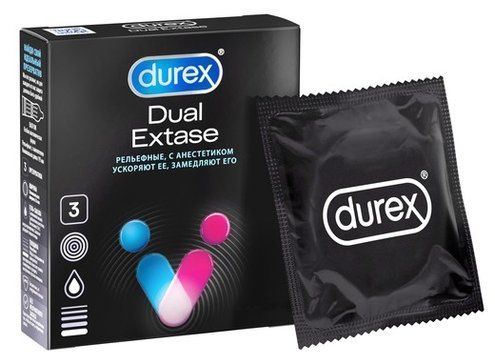 Рельефные презервативы Durex® Dual Extase разработаны для достижения оргазма обоими партнерами. Анестетик (бензокаин - 0,14 г.) внутри презервативов Durex® Dual Extase может помочь продлить половой акт у мужчины, а ребра и пупырышки на поверхности презерватива могут помочь усилить стимуляцию и ускорить наступление оргазма у женщины. Обоюдное удовольствие – один из приоритетов сексуальных отношений.