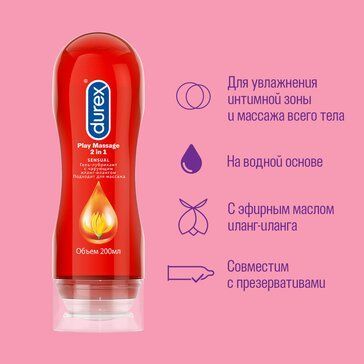 Гель - лубрикант DUREX® Play Massage 2in1 Sensual с чарующим иланг - илангом. Это мягкий, шелковистый массажный гель с нежным ароматом иланг - иланга.