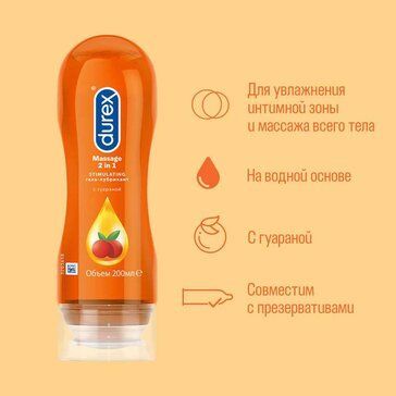 Гель-лубрикант Durex® Massage 2 in 1 Stimulating’ – это гель с гуараной, который прекрасно подходит как для увлажнения интимных областей, так и для деликатного массажа всего тела. Подходит для вагинального, анального и орального секса. Сделайте секс более приятным! 9 из 10 согласны, что секс с гелем лучше*.