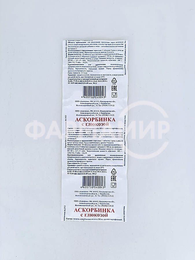 АСКОРБИНОВАЯ К-ТА 100МГ №10 ТАБЛ С ГЛЮКОЗОЙ РОССИЯ