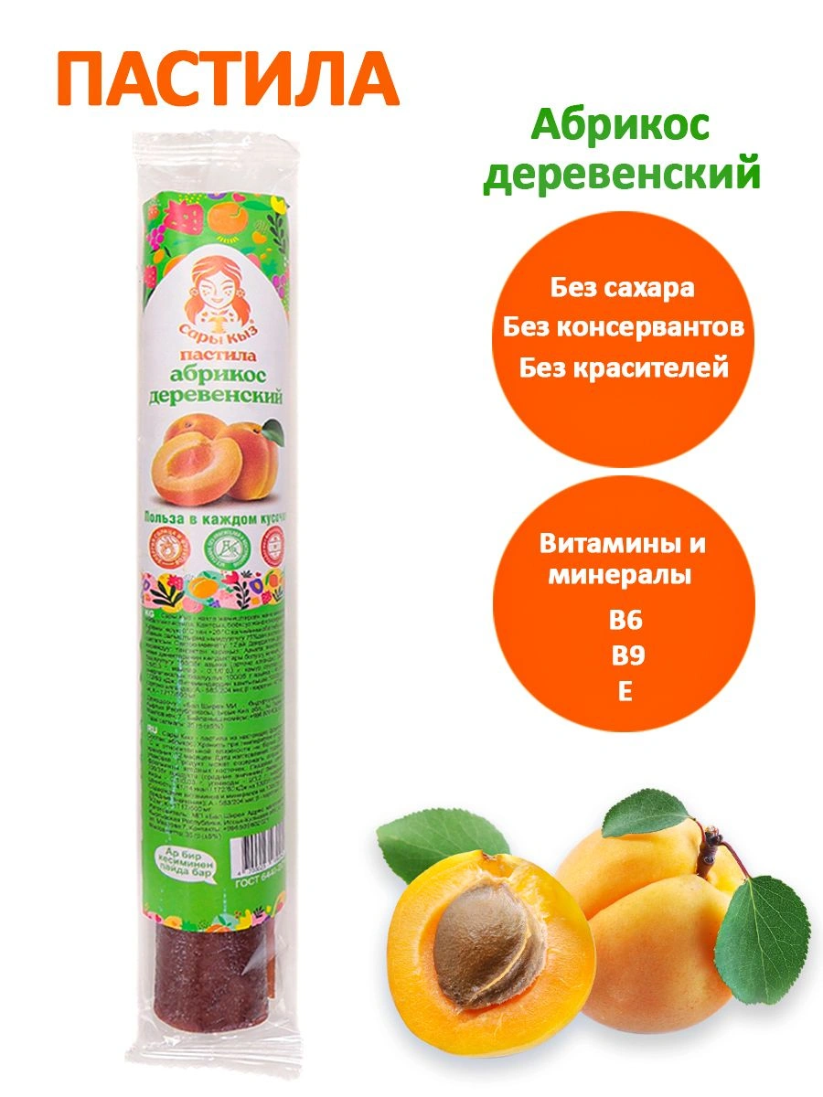 Пастила марки Сары Кыз (Кыргызстан) - вкусный, натуральный и полезный продукт! Пастила изготовлена только из лучших сортов иссык-кульского абрикоса, без добавления сахара, фруктовых соков, красителей, ароматизированных добавок, в составе только спелые абрикосы. Абрикосовая пастила - это кладезь витаминов, необходимых для вашего здоровья! Деревенский абрикос имеет кисло-сладкий вкус. Во вкусе пастилы "Деревенский абрикос " чувствует полная гармония - летняя сладость абрикоса дополнена освежающей кислинкой.