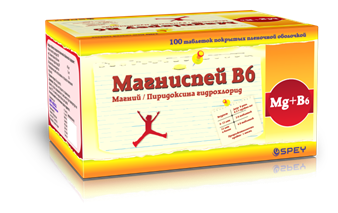 Магниспей В6 - комбинированный препарат, восполняющий дефицит магния и витамина В6. Магний является неорганическим элементом, который присутствует во всех клетках организма и участвует в большинстве реакций обмена веществ, в т.ч. в регуляции передачи нервных импульсов и в сокращении мышц. Организм получает магний вместе с пищей. Дефицит магния может развиваться из-за недостатка питания (недоедание, диеты), плохой кишечной абсорбции, чрезмерного почечного выделения или при увеличении потребности в магнии (при повышенной физической и умственной нагрузке, стрессе, беременности, применении диуретиков). Содержание магния в сыворотке: от 12 до 17 мг/л (0.5-0.7 ммоль/л) говорит об умеренной недостаточности магния; ниже 12 мг/л (0.5 ммоль/л) говорит о тяжелом дефиците магния. Пиридоксин (витамин В 6) является коферментом метаболизма аминокислот и белков, участвует в регуляции метаболизма нервной системы. Фосфорилируется и в виде пиридоксальфосфата входит в состав ферментов, катализирующих декарбоксилирование и переаминирование. Играет важную роль в метаболизме триптофана, глутаминовой кислоты, цистеина, метионина, а также в транспорте аминокислот через клеточную мембрану. Необходим для активации фосфорилазы, для образования нейромедиаторов, гамма-аминомасляной кислоты, глицина, серотонина. Участвует в обмене витамина В и, фолиевой кислоты, в синтезе порфиринов, в обмене ненасыщенных жирных кислот. Улучшает всасывание магния из ЖКТ и его проникновение в клетки.