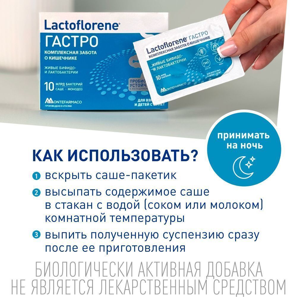Lactoflorene® ГАСТРО выпускается в форме саше-пакетиков, по 10 штук в упаковке. БАД. НЕ ЯВЛЯЕТСЯ ЛЕКАРСТВЕННЫМ СРЕДСТВОМ.