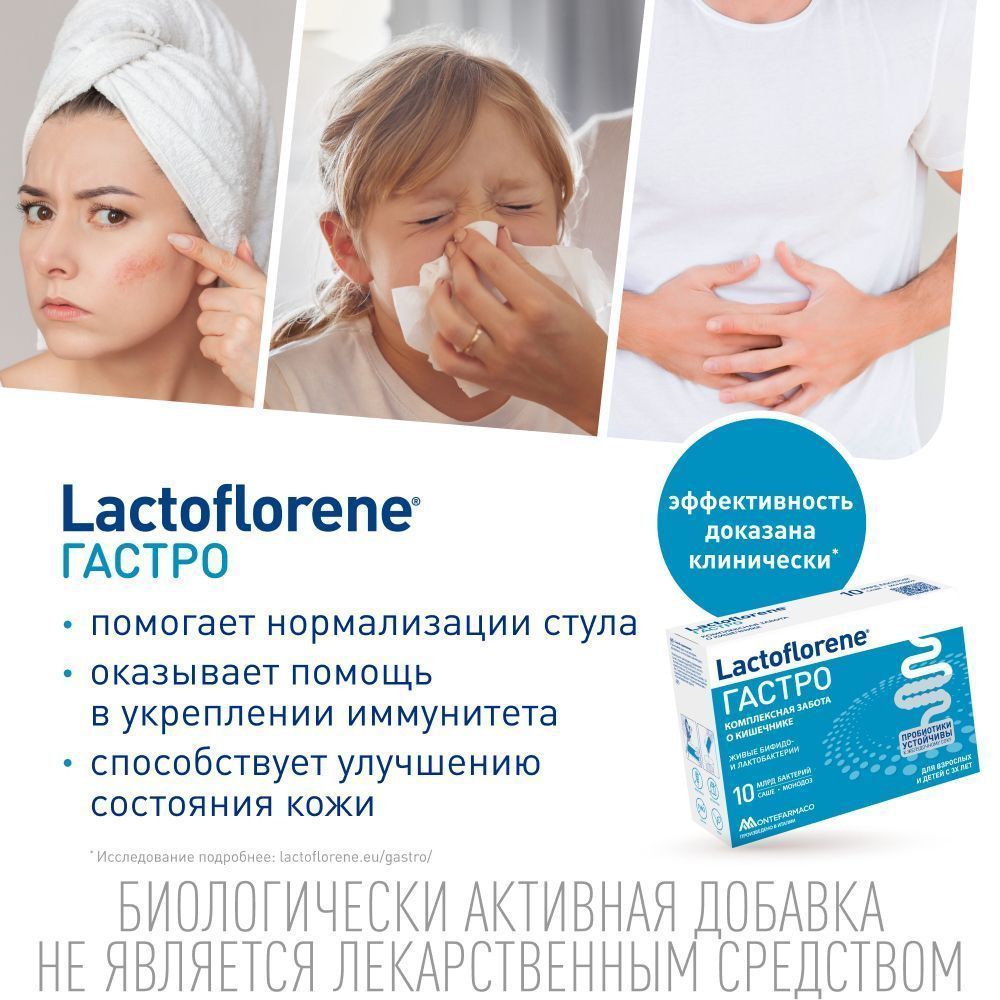 Lactoflorene® ГАСТРО – пробиотический комплекс способствует поддержанию микрофлоры кишечника, нормализации стула, в том числе во время приема антибиотиков и вследствие стрессовых ситуаций. Помогает комфортной дефекации, потенциально уменьшая дискомфорт и вздутие живота. Оказывает помощь в восстановлении микрофлоры кишечника, укреплении иммунитета и поддержке защитных сил организма в сезон простуд. Здоровье кишечника напрямую связано с состоянием кожи. Lactoflorene® ГАСТРО способствует улучшению состояния кожи.