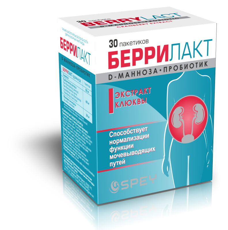 Беррилакт - биологически активная добавка к пище представляет уникальное сочетание пробиотиков, D-маннозы и клюквенного экстракта. Эти три активных компонента поддерживают нормальное функционирование мочевыводящих путей также оказывают благотворное влияние на пищеварительную и иммунную системы. Способствует нормализации функции мочевыводящих путей.